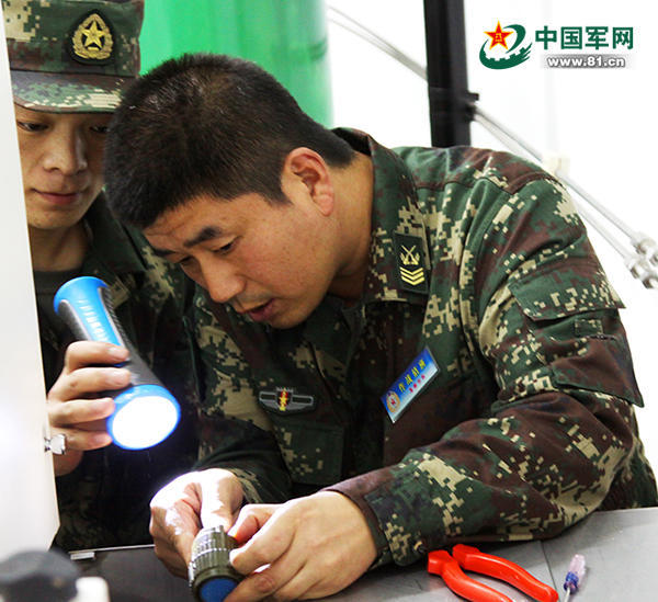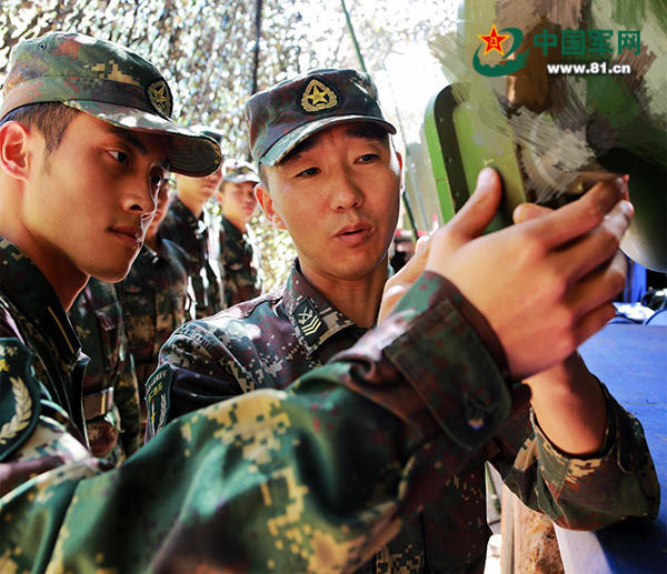 火箭军某旅一级军士长、技师周述雄:多次被评为“装备管理先进个人”和“一级操作号手”,是万能“装备通”和导弹“兵专家”。图为周述雄正在传帮带。