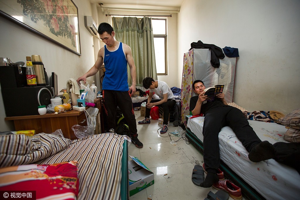 张海启(右一),28岁,山东郓城人。4月份刚来北京,在朝阳区东旭天池摔跤馆练习中国摔。准备5月份和队友们一起去葫芦岛参加全国摔跤锦标赛,目前住在场馆内的集体宿舍。2010年,张海启曾来北京学习摔跤,在地下室住了两年后。张海启现在在济南经营着一家蔬菜粮油店,业余时间钻研中国摔,经常去各个地方参加比赛。 “北京有很多吸引人的地方,但是对我来说就只有每天一起练习中国摔的教练和队友们。”(图片来源:视觉中国)