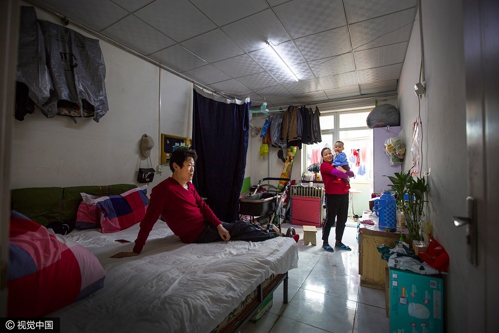 54岁的杨万平(左一)来自安徽芜湖,3月份刚和妻子从上海来到北京,为了照顾不满1岁的孙子,和儿子夫妇俩一家五口人居住在大红门东门里小区的一个房间里,仅用帘子遮挡,房租1600元/月。儿子是水电维修工,儿媳妇是服装店员,年轻夫妻月收入6000元刚刚够整个家庭的每月开销。等孩子到了上学的年龄,他们就回老家,过安稳的日子。 “我们在上海打工十几年,居住在一个平房内,每月才500元,但是北京就贵很多。”(图片来源:视觉中国)