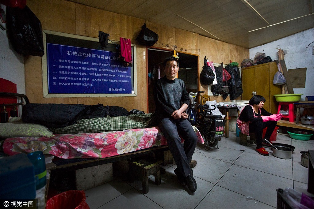 李娜,今年43岁,来自河北义县。2005年来到北京,现在是一名液化气灌装厂的工人,目前居住在大红门东门里小区车库的平房里。除了每天上班,李娜还要负责小区内的夜间车辆看守工作,每月总收入3500元。十二年来,李娜觉得北京住房压力不断上升,刚来北京时,住在久敬庄附近,每月房租才300元两大间,之后搬到角门西,房租涨到1500元。 “现在每天给小区看守车辆,为的就是能免费住在车库,减轻生活压力。”(图片来源:视觉中国)