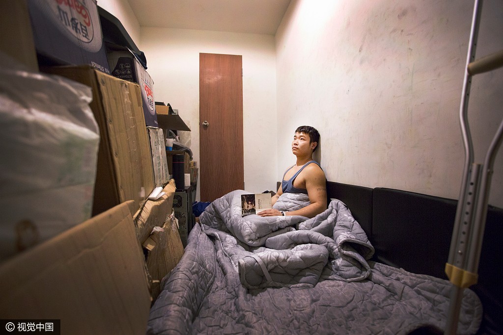 龚晗来自湖南岳阳,今年24岁。2016年9月一个人背着包来到北京,目前是东直门浩沙健身的一名健身教练,每月收入4000元。前段时间,龚晗的脚骨折了,现在他无法做任何事情,因为没有固定住所,暂时住在健身房不足3平方米的仓库内,每天伴随着震耳欲聋的音乐,依靠时间和书本度日。 “我想来北京看看,因为从来都没来过。”(图片来源:视觉中国)