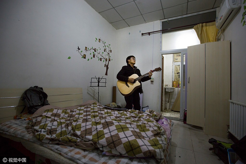 周围,今年28岁,湖北钟祥人,来北京有两年时间,现在是一名程序员,月薪12000元。目前居住在海淀区西北旺附近的自建公寓,月租1400元。他来北京换过几次房子,有的网上租房照片跟实际差很多,通过同事介绍,才找到现在的住所。一个人在北京生活很孤单,周围下班后就在房间内弹吉他,打发时光。 “这里地方偏僻,吃饭、买东西都不太方便,但是离上班的地方近。”(图片来源:视觉中国)