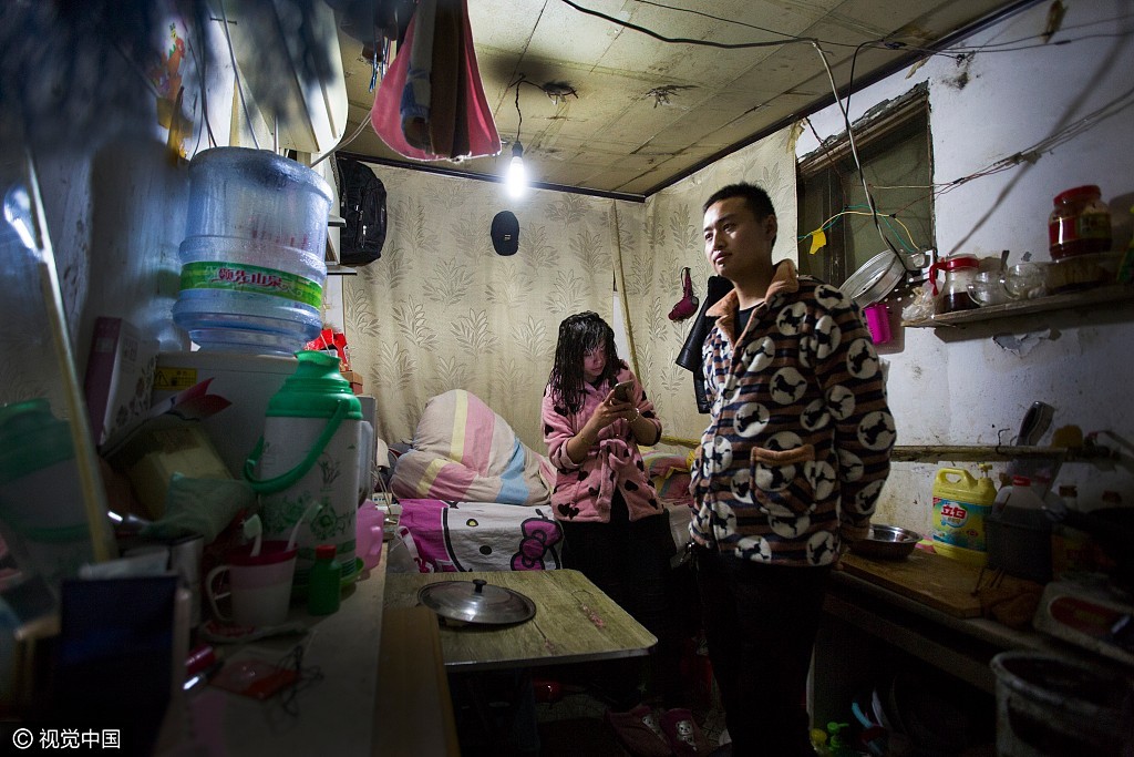 来自河南的刘家浩(右一),今年28岁。2016年7月来到北京,目前住在大红门商贸城附近的平房里,房租200元/月。夫妻两人在商贸城内从事餐饮工作,早出晚归,每月工资合计5000元。他认为在北京收入比老家高些,但同时生活压力也非常大,想过两年回老家开个餐馆,不让媳妇跟着自己在外受苦。 “这里空间太小,上厕所不方便,所有的东西都挤在一起。”(图片来源:视觉中国)
