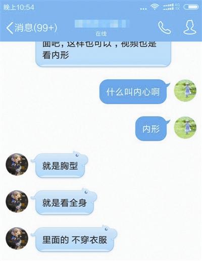 而另一名“招聘者”在询问了记者年龄、所在学校、身高体重三围、有无特长爱好,并查看了记者发送的数十张日常自拍照之后,向记者提出视频面试要求。招聘者自称是“姐姐”,称视频面试过程中不会进行语音聊天,会通过打字进行沟通。“其实我就是看下你的身材。”这名“招聘者”称。
