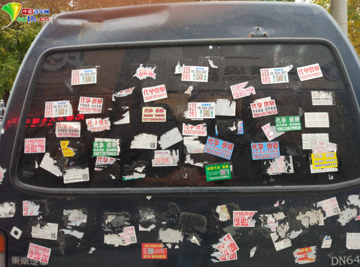 北京大学第三医院生殖中心门前一辆汽车后窗贴满了“供卵、代孕”广告 中国青年网记者 吴阳 摄